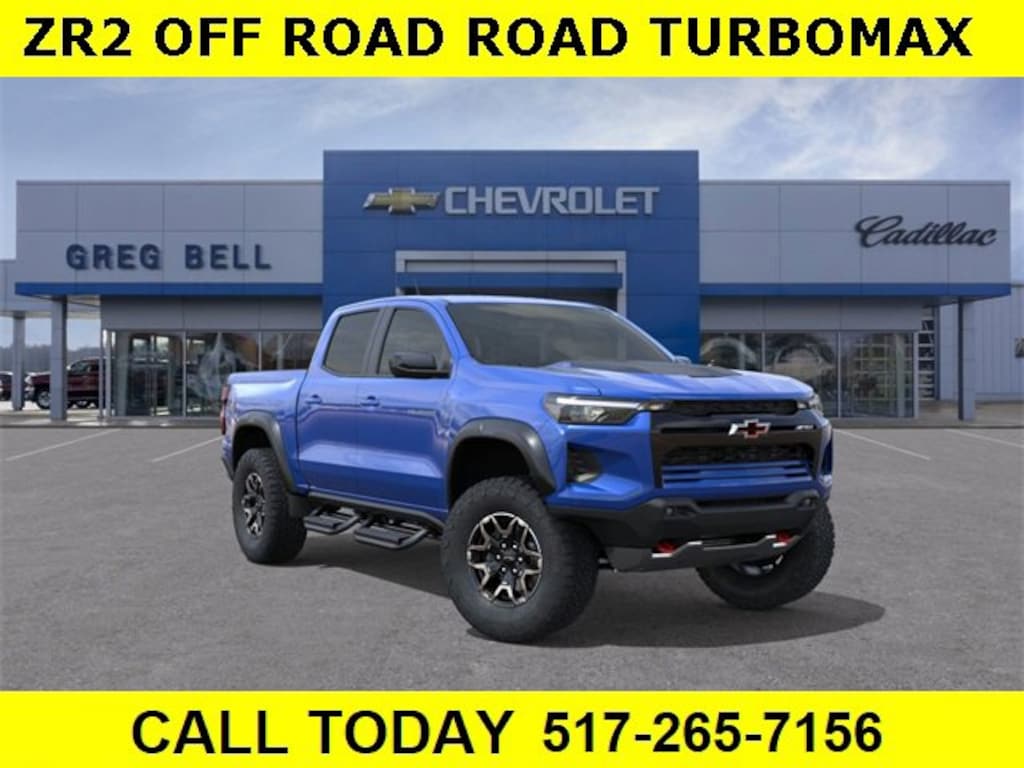 Blue Metallic 2026 Chevrolet Colorado ZR2 4WD 8-Speed Automatic 2.7L I4 Turbocharged DOHC 16V LEV3-ULEV50 310hp 4WD, 3.42 Rear Axle Ratio, 4-Way Manual Passenger Seat Adjuster, 4-Wheel Disc Brakes, 6 Speakers, 6-Speaker Audio System Feature, 8-Way Power Driver Seat Adjuster, ABS brakes, Air Conditioning, Alloy wheels, AM/FM radio: SiriusXM with 360L, Apple CarPlay/Android Auto, Auto High-beam Headlights, Auto-dimming Rear-View mirror, Automatic Emergency Braking, Automatic temperature control, Brake assist, Chevy Safety Assist, Compass, Delay-off headlights, Driver & Front Passenger Heated Seats, Driver & Front Passenger Ventilated Seats, Driver door bin, Driver Memory Settings, Driver Seatback Map Pocket, Driver vanity mirror, Dual front impact airbags, Dual front side impact airbags, Electronic Stability Control, Emergency communication system: OnStar, Following Distance Indicator, Forward Collision Alert, Front anti-roll bar, Front Bucket Seats, Front Center Armrest, Front dual zone A/C, Front fog lights, Front Passenger Seatback Map Pocket, Front Pedestrian & Bicyclist Braking, Front reading lights, Front wheel independent suspension, Heated door mirrors, Heated front seats, Heated steering wheel, Illuminated entry, IntelliBeam Automatic High Beam On/Off, Lane Keep Assist w/Lane Departure Warning, Low tire pressure warning, Memory seat, Navigation System, Occupant sensing airbag, Outside temperature display, Overhead airbag, Overhead console, Panic alarm, Passenger door bin, Passenger vanity mirror, Perforated Leather-Appointed Seat Trim, Power door mirrors, Power Driver Lumbar Control Seat Adjuster, Power driver seat, Power steering, Power windows, Preferred Equipment Group 4ZR, Radio data system, Radio: 11.3 Diagonal Advanced Color LCD Display, Rear reading lights, Rear seat center armrest, Rear step bumper, Rear window defroster, Remote keyless entry, Removable Front & Rear Off-Road Assist Steps (LPO), Security system, SiriusXM w/360L Trial Subscription, Speed control, Speed-sensing steering, Split folding rear seat, Steering Wheel Mounted Audio Controls, Steering wheel mounted audio controls, Tachometer, Telescoping steering wheel, Tilt steering wheel, Traction control, Trip computer, Variably intermittent wipers, Ventilated front seats, Wheels: 17 x 8 Graphite & Oxide Gold Aluminum, Wireless Phone Projection, ZR2 Off-Road Package, 4WD.