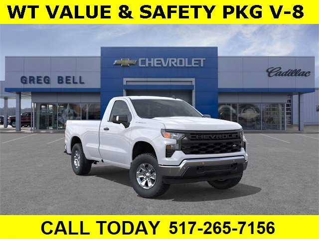 Summit White 2026 Chevrolet Silverado 1500 WT 4WD 8-Speed Automatic EcoTec3 5.3L V8 8-Speed Automatic, 4WD, Jet Black Vinyl, 120-Volt Bed Mounted Power Outlet, 120-Volt Interior Power Outlet, 170 Amp Alternator, 2 Speakers, 2-Speaker Audio System, 220 Amp Alternator, 3.23 Rear Axle Ratio, 3.42 Rear Axle Ratio, 3.5 Monochromatic Display Driver Info Center, 4-Way Manual Driver Seat Adjuster, 4-Wheel Disc Brakes, 40/20/40 Front Split Bench Seat, ABS brakes, Air Conditioning, Apple CarPlay/Android Auto, Auto High-beam Headlights, Auto-Locking Rear Differential, Automatic Emergency Braking, Auxiliary External Transmission Oil Cooler, Black (Semi-Gloss) Front Bumper, Black (Semi-Gloss) Rear Bumper, Bluetooth® For Phone, Brake assist, Chevytec Spray-On Black Bedliner, Compass, Deep-Tinted Glass, Delay-off headlights, Driver door bin, Dual front impact airbags, Dual front side impact airbags, Electric Rear-Window Defogger, Electronic Cruise Control, Electronic Stability Control, Emergency communication system: OnStar, External Engine Oil Cooler, EZ Lift Power Lock & Release Tailgate, Following Distance Indicator, Forward Collision Alert, Front anti-roll bar, Front Center Armrest w/Storage, Front Chrome Bumper, Front Frame-Mounted Black Recovery Hooks, Front Pedestrian Braking, Front reading lights, Front wheel independent suspension, Fully automatic headlights, HD Rear Vision Camera, Heated door mirrors, Heated Power-Adjustable Outside Mirrors, Heavy-Duty Air Filter, High Gloss Black Mirror Caps, Hitch Guidance, Illuminated entry, Inside Rear-View Mirror w/Tilt, IntelliBeam Automatic High Beam On/Off, Lane Change Alert w/Side Blind Zone Alert, Lane Keep Assist w/Lane Departure Warning, Locking Tailgate, Low tire pressure warning, Manual Tailgate Function w/No EZ Lift, Manual Tilt Wheel Steering Column, Occupant sensing airbag, OnStar Services Capable, Outside temperature display, Overhead airbag, Overhead console, Panic alarm, Passenger door bin, Passenger vanity mirror, Perimeter Lighting, Power door mirrors, Power Front Windows w/Driver Express Up/Down, Power Front Windows w/Passenger Express Down, Power steering, Power windows, Preferred Equipment Group 1WT, Premium audio system: Chevrolet Infotainment 3, Radio data system, Radio: Chevrolet Infotainment 3 System, Rear Chrome Bumper, Rear Cross Traffic Braking, Rear Pedestrian Alert, Rear reading lights, Rear step bumper, Remote Keyless Entry, Remote keyless entry, Rubberized-Vinyl Floor Covering, SiriusXM Delete, Solar Absorbing Tinted Glass, Speed control, Speed-sensing steering, Standard Suspension Package, Standard Tailgate, Tachometer, Teen Driver, Tilt steering wheel, Tire Pressure Monitoring System, Traction control, Trailering Package, Trip computer, Ultrasonic Front & Rear Park Assist, Variably intermittent wipers, Vinyl Seat Trim, Voltmeter, Wheels: 17 x 8 Bright Silver Painted Aluminum, Wheels: 17 x 8 Ultra Silver Painted Steel, Wi-Fi Hot Spot Capable, Work Truck Package, WT Convenience Package, WT Safety Package, WT Value Package, 8-Speed Automatic, 4WD, Jet Black Vinyl.