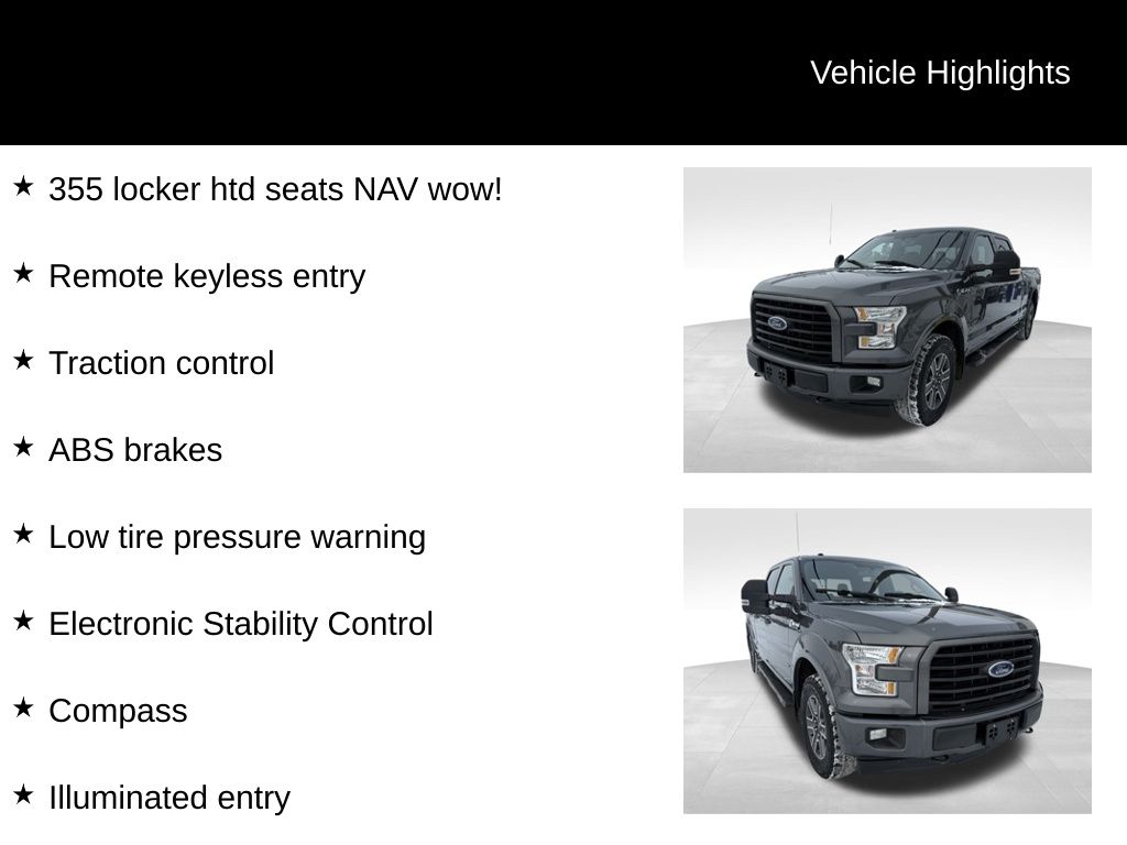 4WD, ABS brakes, Alloy wheels, Compass, Electronic Stability Control, Illuminated entry, Low tire pressure warning, Remote keyless entry, Traction control, 10-Way Power Driver's & Passenger Seats, 110V/400W Outlet, 4-Wheel Disc Brakes, 4.2" Productivity Screen in Instrument Cluster, 6 Speakers, Air Conditioning, AM/FM radio, Auto-Dimming Rear-View Mirror, BoxLink, Brake assist, Bumpers: chrome, CD player, Chrome Billet Style Grille w/Chrome Surround, Chrome Door & Tailgate Handles w/Body-Color Bezel, Chrome Step Bars, Class IV Trailer Hitch Receiver, Cloth 40/20/40 Front Seat, Delay-off headlights, Driver door bin, Driver vanity mirror, Dual front impact airbags, Dual front side impact airbags, Electronic Locking w/3.55 Axle Ratio, Equipment Group 302A Luxury, Front anti-roll bar, Front Center Armrest w/Storage, Front fog lights, Front reading lights, Front wheel independent suspension, Fully automatic headlights, GVWR: 7,050 lbs Payload Package, Heated Front Seats, Leather-Wrapped Steering Wheel, LED Box Lighting, Occupant sensing airbag, Outside temperature display, Overhead airbag, Panic alarm, Passenger door bin, Passenger vanity mirror, Power door mirrors, Power Glass Heated Sideview Mirrors, Power steering, Power windows, Power-Adjustable Pedals, Power-Sliding Rear Window, Radio data system, Radio: AM/FM Stereo/Single-CD Player, Radio: Single-CD w/SiriusXM Satellite, Rear reading lights, Rear step bumper, Rear Under-Seat Storage, Rear View Camera w/Dynamic Hitch Assist, Rear Window Defroster, Remote Start System, Reverse Sensing System, Security system, Single-Tip Chrome Exhaust, Speed control, Speed-sensing steering, Split folding rear seat, Steering wheel mounted audio controls, SYNC, SYNC 3, Tachometer, Telescoping steering wheel, Tilt steering wheel, Variably intermittent wipers, Voltmeter, Wheels: 17" Silver Painted Aluminum, Wheels: 18" Chrome-Like PVD, XLT Chrome Appearance Package, 355 locker htd seats NAV wow!, 4WD, ABS brakes, Alloy wheels, Compass, Electronic Stability Control, Illuminated entry, Low tire pressure warning, Remote keyless entry, Traction control.