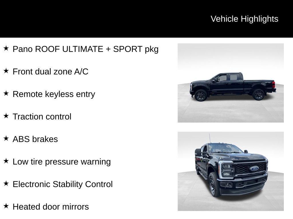 4WD, ABS brakes, Alloy wheels, Compass, Electronic Stability Control, Electronic-Locking w/3.31 Axle Ratio, Front dual zone A/C, Heated door mirrors, Heated front seats, Heated rear seats, Illuminated entry, Low tire pressure warning, Remote keyless entry, Traction control, 4-Way Adjustable Headrests, 4-Wheel Disc Brakes, 8 Speakers, Adjustable pedals, Air Conditioning, AM/FM radio: SiriusXM with 360L, Auto High-beam Headlights, Auto tilt-away steering wheel, Auto-dimming Rear-View mirror, Automatic temperature control, Black Tow Hooks, Body-Color Front & Rear Bumpers, Body-Color Mirror Caps, Brake assist, Bumpers: chrome, Chrome Exhaust Tip, Dark Painted Grille, Delay-off headlights, Driver door bin, Driver vanity mirror, Dual front impact airbags, Dual front side impact airbags, Emergency communication system: SYNC 4 911 Assist, Exterior Parking Camera Rear, F-250 >10K GVWR Package, Flow-Through Console, Front anti-roll bar, Front Bucket Seats, Front Center Armrest, Front fog lights, Front Leather-Trimmed 40/Console/40 Seats, Front reading lights, Front Sensing System, Fully automatic headlights, Garage door transmitter, Head-Up Display, Heated steering wheel, Intelligent Adaptive Cruise Control w/Stop-and-Go, Lane Keeping Assist, Lariat Ultimate Package, Leather steering wheel, Memory seat, Navigation system: Connected Navigation, Order Code 608A, Outside temperature display, Overhead airbag, Overhead console, Panic alarm, Passenger door bin, Passenger vanity mirror, Pedal memory, Platform Running Boards, Power door mirrors, Power driver seat, Power passenger seat, Power steering, Power windows, Power-Deployable Running Boards, Pro Trailer Backup Assist, Pro Trailer Hitch Assist, Radio: B&O Sound System by Bang & Olufsen, Radio: B&O Unleashed Sound System by Bang & Olufsen, Rain sensing wipers, Rear reading lights, Rear seat center armrest, Rear step bumper, Rear window defroster, Security system, SiriusXM Radio w/360L, Speed control, Split folding rear seat, Sport 4x4 Box Side Decal, Sport Appearance Package, Steering wheel memory, Steering wheel mounted audio controls, SYNC 4 w/Enhanced Voice Recognition, Tachometer, Tailgate Step & Handle, Telescoping steering wheel, Tilt steering wheel, Tow Technology Package, Trip computer, Turn signal indicator mirrors, Twin Panel Power Moonroof, Upfitter Switches (6), Variably intermittent wipers, Ventilated front seats, Wheels: 18" Bright Machined & Carbonized Gray Alum, Wheels: 20" Dark Carbonized Gray Painted Aluminum, Wireless Charging Pad, Pano ROOF ULTIMATE + SPORT pkg, 4WD, ABS brakes, Alloy wheels, Compass, Electronic Stability Control, Electronic-Locking w/3.31 Axle Ratio, Front dual zone A/C, Heated door mirrors, Heated front seats, Heated rear seats, Illuminated entry, Low tire pressure warning, Remote keyless entry, Traction control.